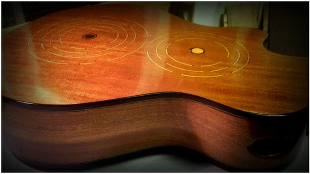 The soundboard is Caucasian Spruce. The fretboard and bindings are ebony. The rosette, inlaid with shells from the Sea of Galilee, is my artistic representation of our rapidly warming Planet Earth, orbiting in space. Scale length 660mm.