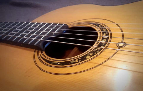 This is a large bodied flameco guitar, the same body shape as the 'Red Earth' guitar above, but with Cypress body. Also with a powerful, deep response, especially strong on the bass. Unusually for modern flamenco guitars, I have used wood for the golpeadores instead of the more commonly used plastic. This is something you would have found on older guitars, before the invention of plastic. It gives a more woody tone, especially for tapping techniques and gives ample protection to the soundboard, which is very thin and lightly braced. As with all my flamenco guitars, this is very lightly built, making it extremely responsive. The large body size adds increased volume and projection, making this an ideal guitar to accompany other instruments, singers and percussion.