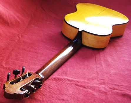 The woods I used for the inlay were cypress, almond and olive, from trees around my garden here in Galilee. Shells from the Sea of Galilee were also used to add some sparkle around the soundhole and also in the heel cap.