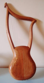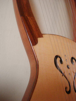 The Lyre is a very ancient instrument, dating back thousands of years. Here are two examples of my interpretation, a twelve string and a ten string. The body is carved from a single piece of cherry wood, topped with a spruce soundboard.